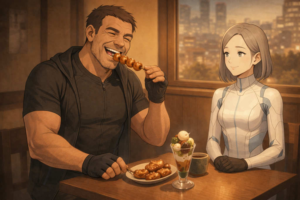 濃い味と、甘さと、ひと息。速さに抗うように、レックはゆっくり噛みしめる。その横でビアンは、人が“戻ってくる瞬間”を静かに見ていた。※画像はイメージです。