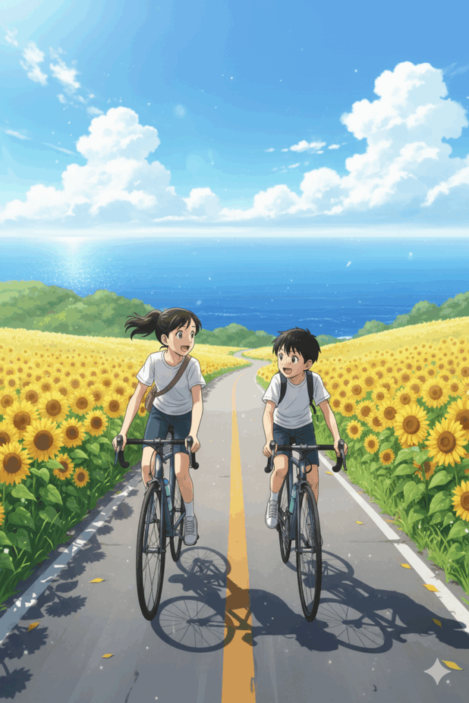 ひまわりが風に揺れ、蝉の声が響き、潮の匂いが夏の日差しに混じって漂う。