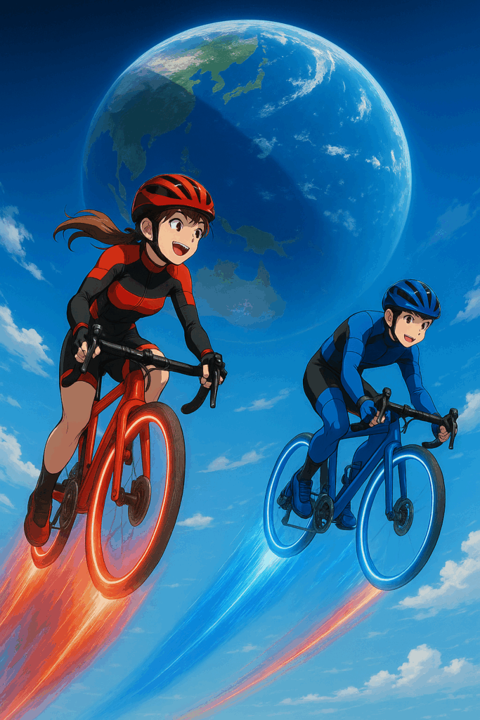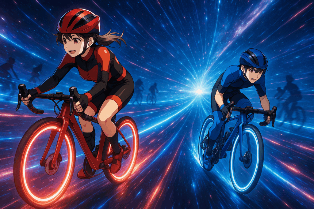 アキの赤い車体が燃えるように光り、ヒロの青い機体がそれを追う。